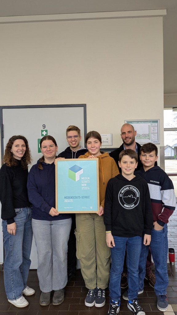 Auch im auslaufenden Kalenderjahr konnte das Medienscout-Team durch ihr Engagement erneut das Medienscout-Abzeichen für das St.-Michael-Gymnasium erwerben. Mathias Els und Anna-Luisa Els haben das Team im Laufe des Jahres verlassen, um sich auf andere schulische Aufgaben zu konzentrieren. An dieser Stelle ein großes Dankeschön für das langjährige Engagement. Neu hinzugekommen und in der Ausbildung befinden sich Jan Wetzel, Lewis Gaspers und Noah Kaldenbach, die zur Zeit von den erfahrenen Medienscouts Christine Haake und Pauline Klatt an ihre Aufgaben herangeführt werden. Die Medienscouts führen regelmäßig in den verschiedenen Jahrgangsstufen Workshops zu unterschiedlichen Themen durch. Zuletzt wurden die Fünftklässler über die Gefahren des "Cybergroomings" aufgeklärt. Die Medienscouts sind zusätzlich jeden Mittwoch in der ersten großen Pause im Raum von Frau Cloesgen anzutreffen und stehen für eure Fragen und Probleme rund um das Thema Internet, Social Media und weitere digitale Themen zur Verfügung.