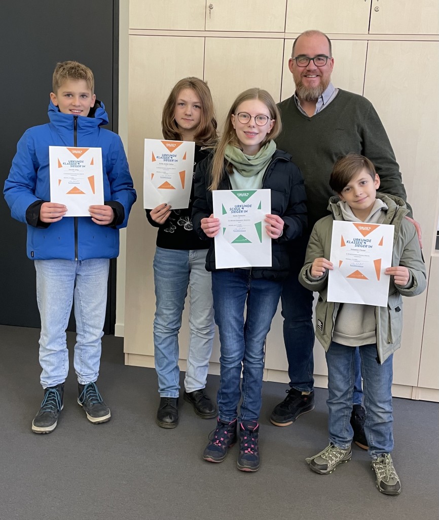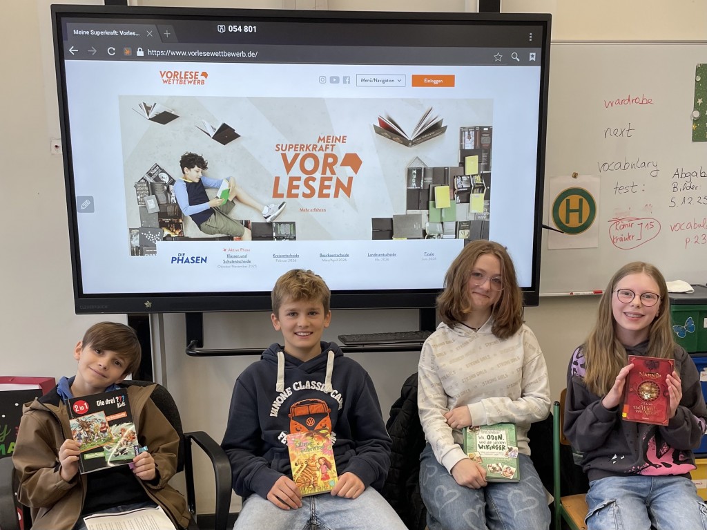 Am 12.12.25 fand unser diesjähriger Vorlesewettbewerb der sechsten Klassen statt. Teilnehmer waren die Klassensieger der Klassen 6a bis d: Sebastian Förster, Hendrik Ohlig, Emely Aileen Gallus und Merle Garborini. Alle vier Teilnehmer überzeugten nicht nur durch flüssiges Vorlesen, sondern auch richtig gute Betonungen, sodass wir uns beim Zuhören schnell in die Geschichten hineinversetzen konnten. Die Jury bestand dieses Jahr aus Maja Kühnemann aus der 9c, Mia Delahaye aus der EF und Finn Krutina aus der Q1, Frau Kremer-Hees und Herrn Kaulard. Alle drei jurierenden Schüler haben eigene Erfolge in vergangenen Vorlesewettbewerben errungen und konnten sich daher gut in die Situation hineinversetzen. Sie gaben den Sechstklässlern nach den beiden Vorleserunden, einmal den vorbereiteten Text und einmal den bis dahin unbekannten Text, qualifizierte Rückmeldungen und Tipps. Am Ende entschied sich die Jury für Merle Garborini, die unsere Schule dann im Februar beim Regionalwettbewerb in der Mayerschen Buchhandlung vertreten wird. Viel Erfolg, Merle!