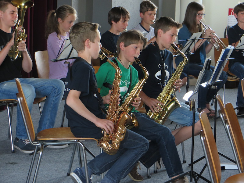 Im dritten Programmblock wurde dann eifrig musiziert. Die 6a ist die Orchesterklasse der Jahrgangsstufe 6: Einige Schüler spielten zu Beginn der 5. Klasse schon ein Instrument und einige haben vor knapp zwei Jahren erst angefangen, ein Instrument zu spielen. Teile der Orchesterklasse spielten zum Auftakt das Lied "Unter dem Meer", die Filmmusik zu "Arielle die Meerjungfrau". Nach dem Lachen im vorigen Programmblock führte dies zu einer angenehmen Entspannung im Publikum. Die gesamte Klasse wurde als Orchester und Chor mit Sologesängen einbezogen in die Präsentation von "We are the world" von Michael Jackson und Lionel Richie. Das Publikum war begeistert.